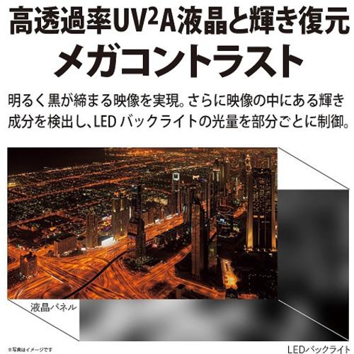 豊かでリアルな10億色以上の色再現「リッチカラ―テクノロジープロ」高透過率液晶と高輝度HDRによる輝き復元「メガコントラスト」映像の明暗レベルを解析し、バックライトを制御。