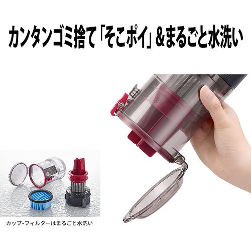 ボタンを押すだけ、ワンタッチで簡単に底からゴミが捨てられます。カップとフィルターはまるごと水洗いできます。