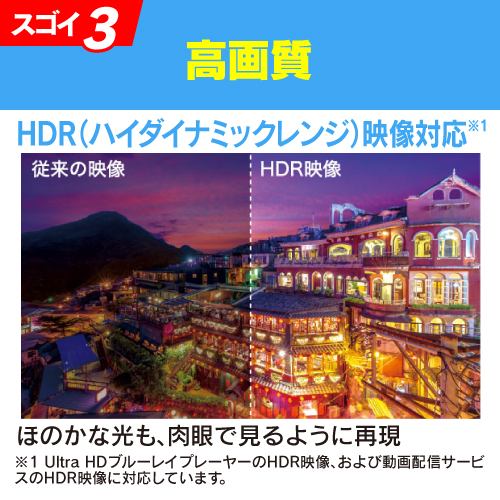 豊かな階調表現が得られるハイコントラストを用いて、明るい部分と暗い部分の差をより明確に描き分けます。また、BS4K・110度CS4K放送のHDR規格HLG(ハイブリッド・ログガンマ)にも対応した高画質4K放送をご覧いただけます。