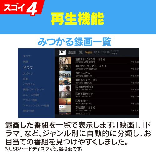 テレビ視聴用のチューナーとは別に、録画用のチューナーを搭載。地デジだけでなく、BS/CS 4K放送も視聴中の番組とは別の番組が録画できます。※別売りのUSBハードディスクが必要です