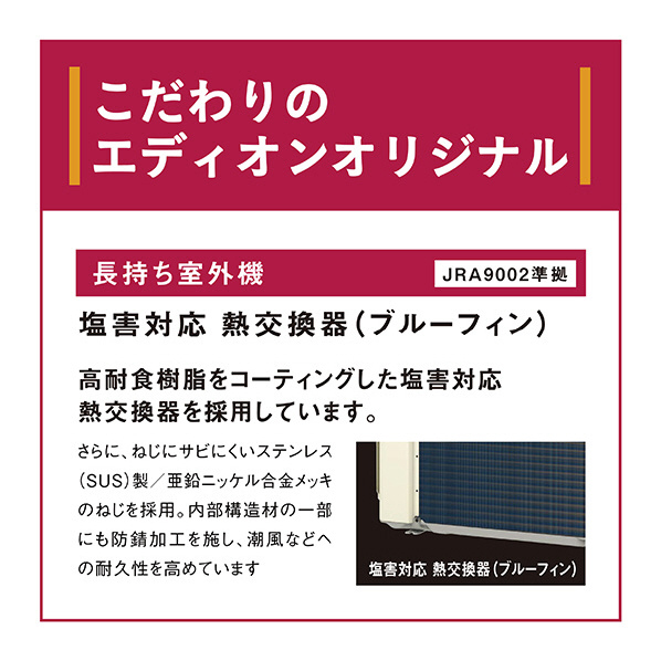 ●「長持ち室外機(JRA9002準拠)」塩害対応熱交換器で丈夫。