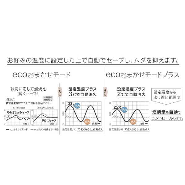 ・(3)設定温度より2℃高くなると自動消火し、設定温度より1℃低くなると自動点火。快適な温度に自動で保ちます。