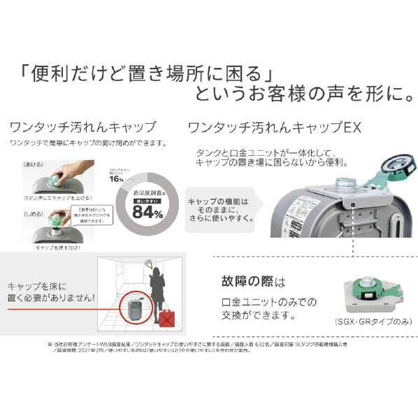 ・灯油長持ちで給油の手間が大幅に減ります。また、タンクの上下に「とって」が2本あるから、両手でしっかり持つことができ、持ち運びに便利です。